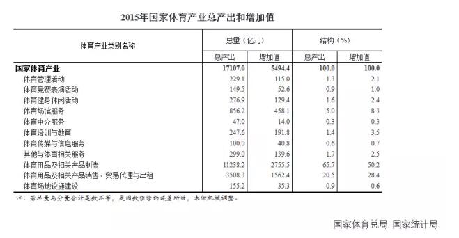 2015年国家体育产业总产出(总规模)为1.7万亿元,比2014年增长26.02%,增加值为5494亿元,占同期国内生产总值比重为0.8%。明显能够看出2015年各方面数据增长较为显著,充分体现了国家政策对于体育产业发展的引领作用。5494亿元几乎接近斯里兰卡2016年的GDP总量。