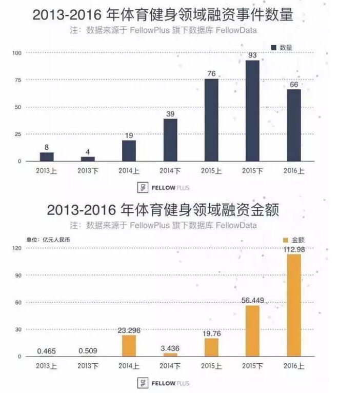 在政策红利驱使下,体育产业成为投资风口。2014 年—2015 年,体育产业投融资事件及数量呈双增长。公开资料显示,2014年有56家体育创业公司获得融资,融资金额总数达到25.05亿元。2015年体育产业投融资出现井喷,投资金额和投资数量均出现直线上升。根据艾瑞咨询资料,2015年,体育行业整体获投金额超65亿元,是2014年的2.7倍,比2013年翻了164倍。