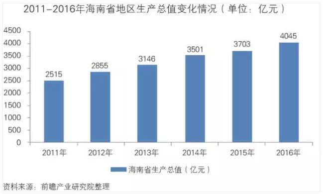 2016年全省地区生产总值4044.51亿元,按可比价格计算,比上年增长7.5%。2011-2016年,海南省的GDP保持较快增长态势,为体育发展事业提供了坚实基础,有利于体育产业在海南地区发展。