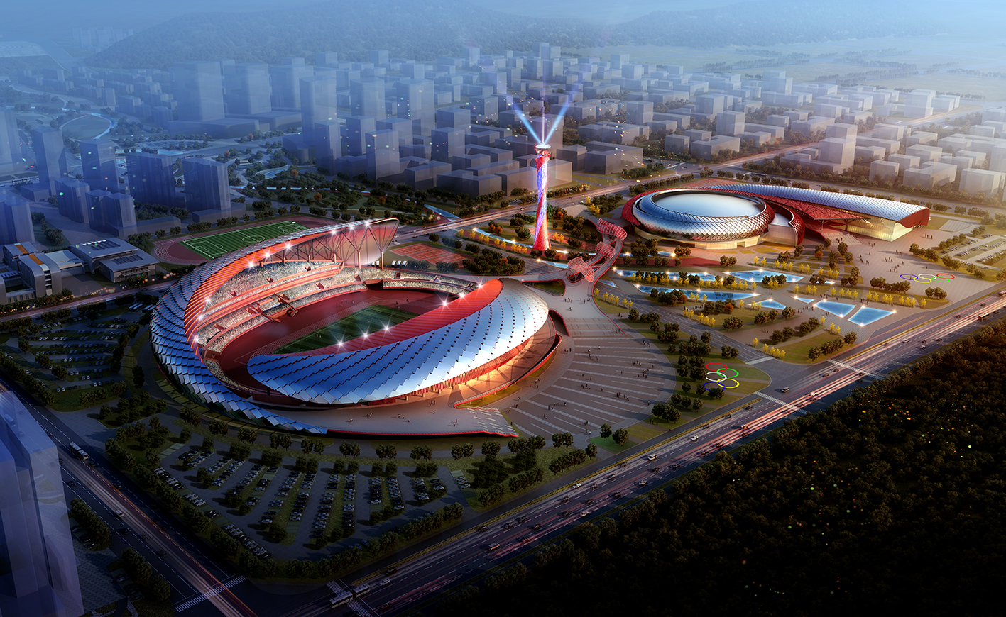 蚌埠奥体中心占地面积514亩,总建筑面积14.4万㎡。建成后将成为2018年 安徽省第十四届运动会举办的主要场馆, 主体建筑包括“两馆一场”:体育场、体育馆、多功能馆以及一个体育学校和一个景观塔,从南到北整合并列一体化设计。